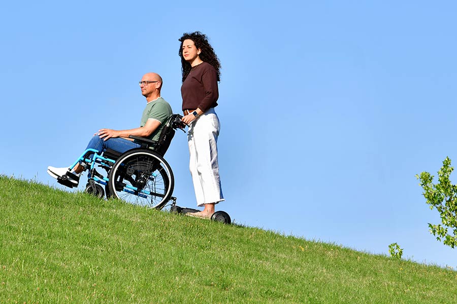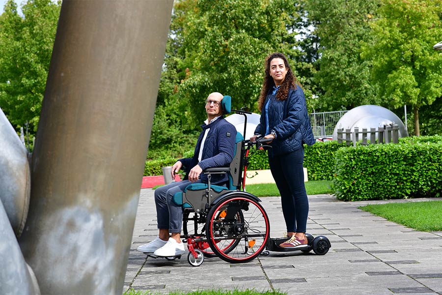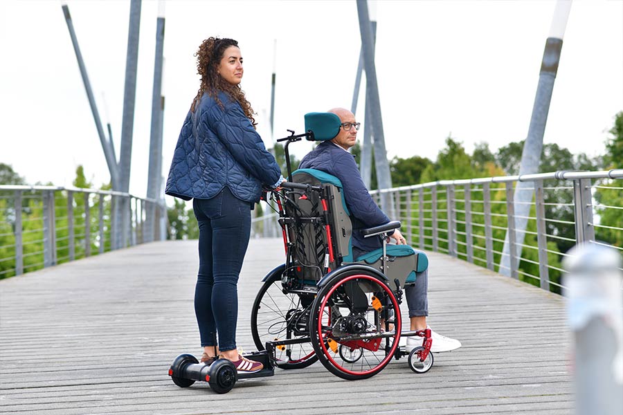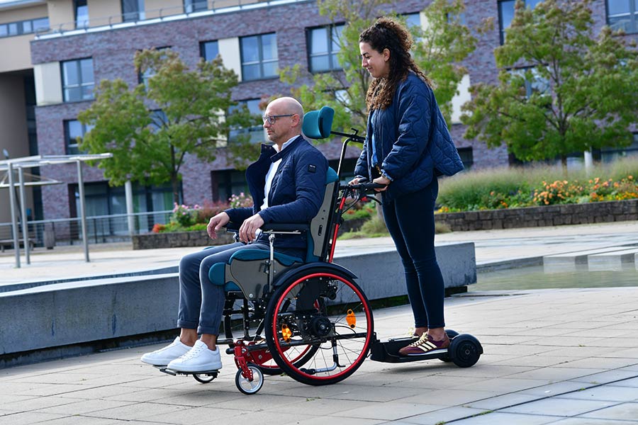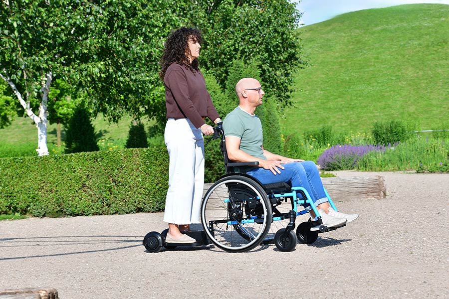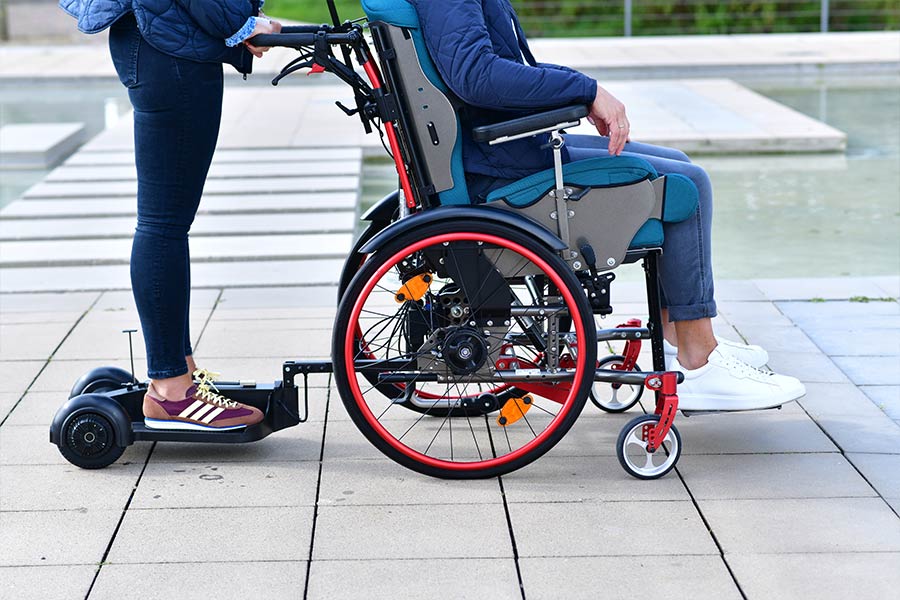 Die elektrische Schiebehilfe zum Mitfahren erleichtert den Alltag vieler Rollstuhlnutzer und deren Begleitpersonen.