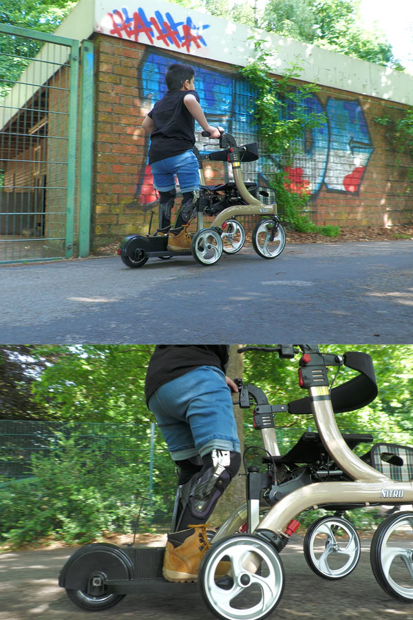 - Für die Nutzung als Rollator lässt sich das Standboard mit wenigen Handgriffen hochklappen.