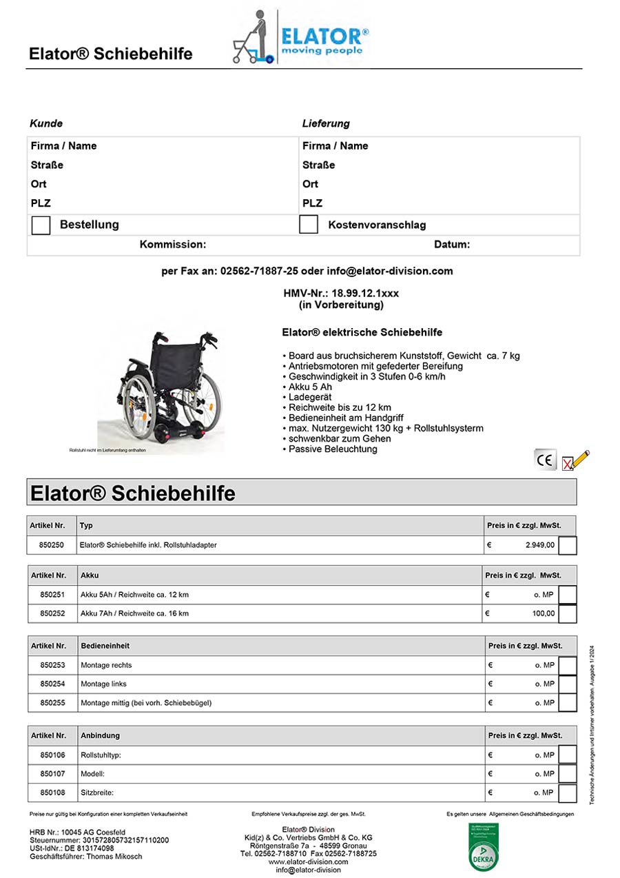 Zum Marktstart soll der Elator® zu einer unverbindlichen Preisempfehlung ab € 2450,-- (zzgl. 7% Umsatzsteuer) in Deutschland angeboten werden. Der Preis in Österreich und der Schweiz kann steuerbedingt abweichen.