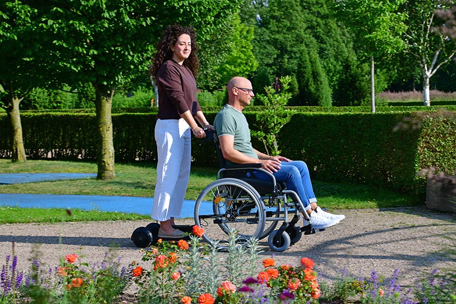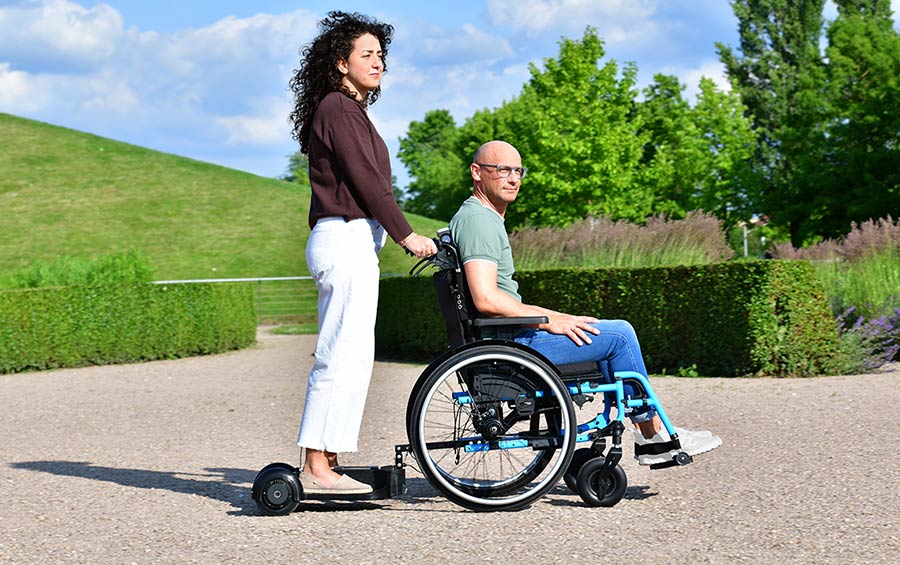 Die elektrische Schiebehilfe zum Mitfahren erleichtert den Alltag vieler Rollstuhlnutzer und deren Begleitpersonen.